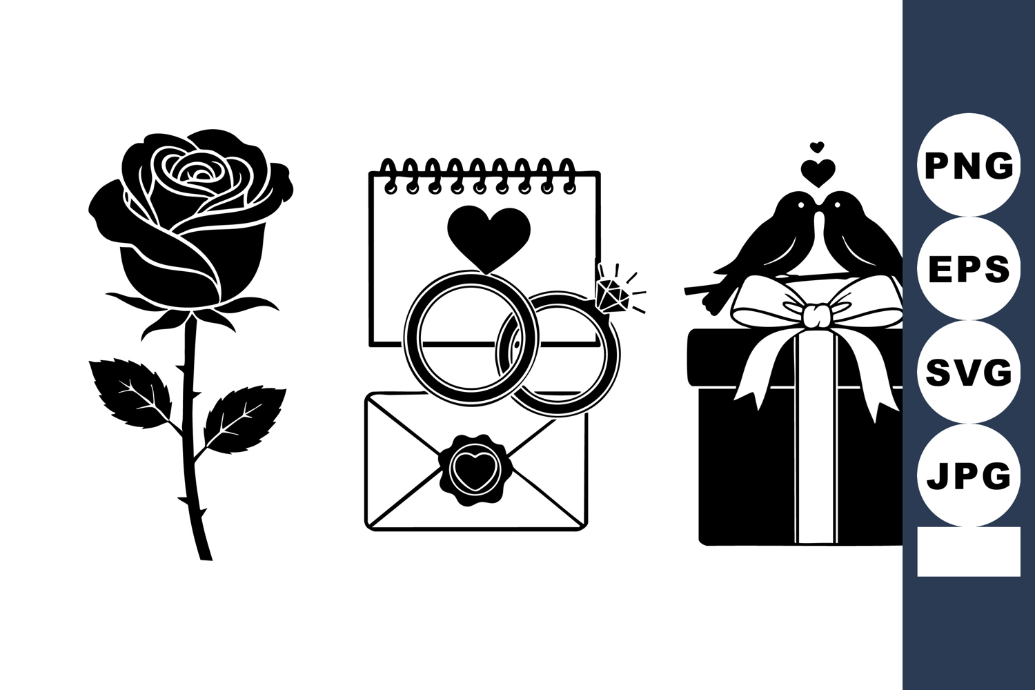 Wedding Invitation Graphics Love Letter Envelope Black White Wedding Romantic Wedding Clipart Minimalist Wedding Icons Engagement Rings Planner Kissing Doves Giftbox Rose Stem Silhouette Bridal Stationery Design Anniversary Celebration Symbols