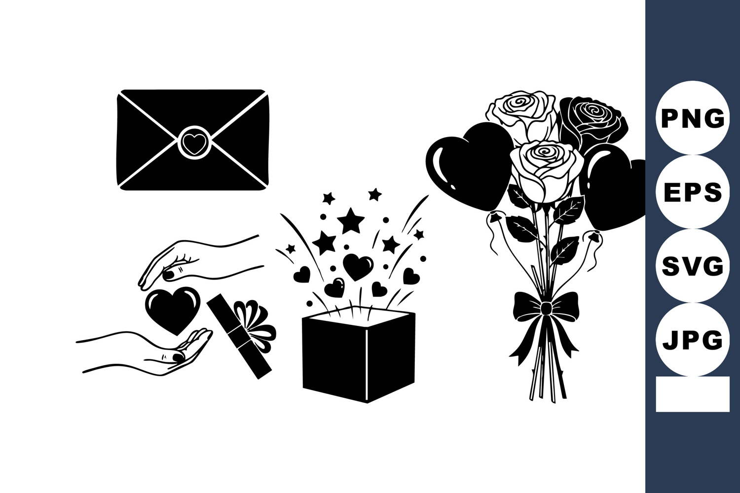 Love Letter Envelope Valentine Greeting Card Heart Balloon Illustration Romantic Love Clipart Black Silhouette Valentine Minimal Valentine Icons Exploding Gift Box Valentines Day Symbols Bouquet Roses Hearts Hands Giving Heart