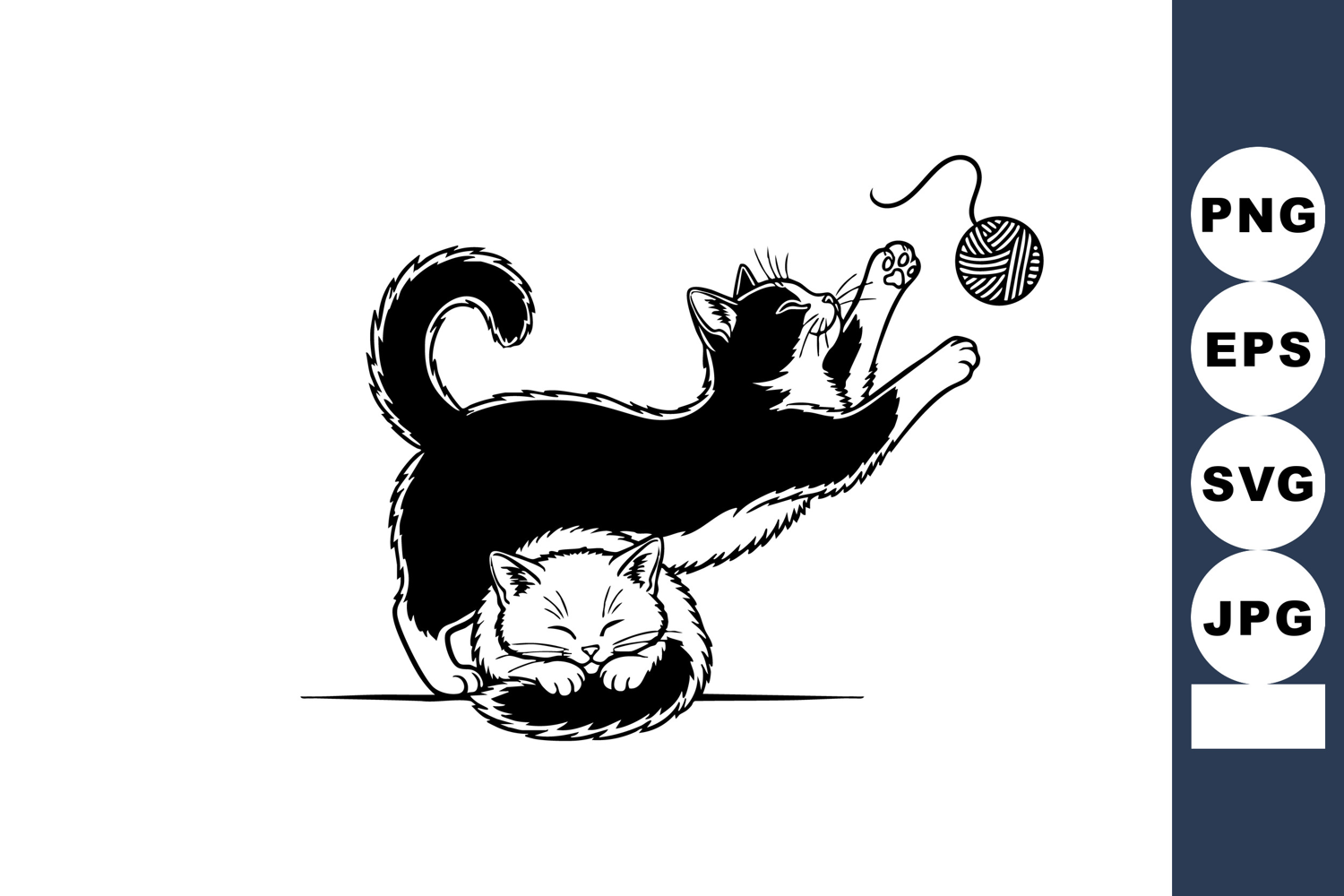 Two contrasting cats appear in bold black and white line art, with one peacefully sleeping while the other jumps toward a dangling yarn ball, ideal for pet posters, stickers, and playful branding graphics.