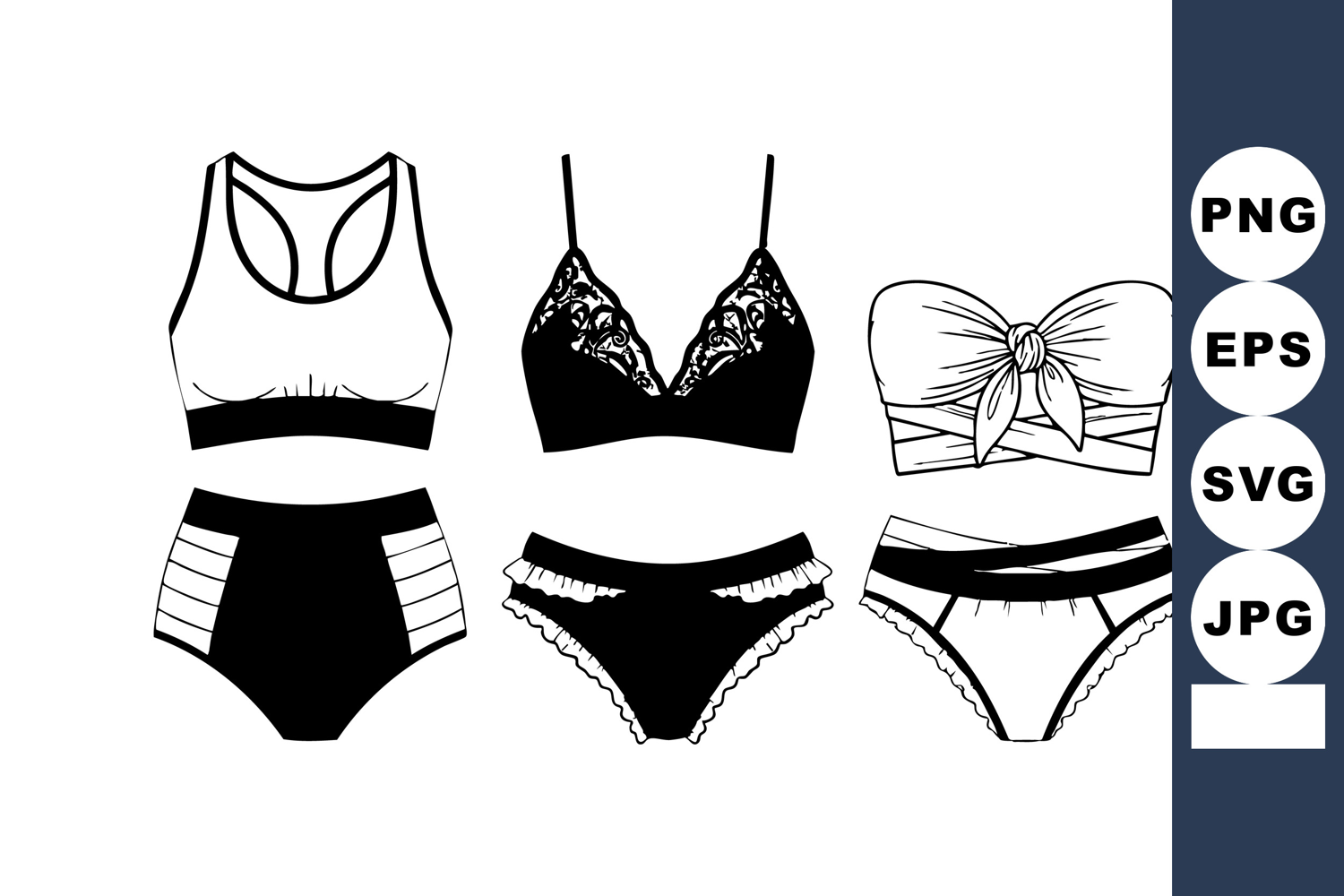 Minimal black and white fashion vector displays six womens lingerie and bikini styles, including sports bra, lace bralette, bandeau top and matching bottoms, ideal for apparel design, catalog layouts and sewing pattern guides, stylish.