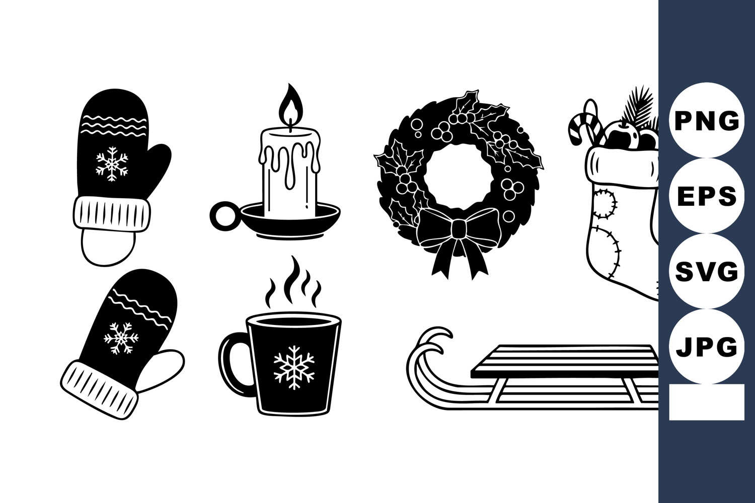 Black and white holiday icon collection presents cozy winter mittens, hot drink mug, dripping candle, holly wreath, gift filled stocking, and traditional sled, ideal for Christmas cards, stickers, and seasonal branding, cheerful.