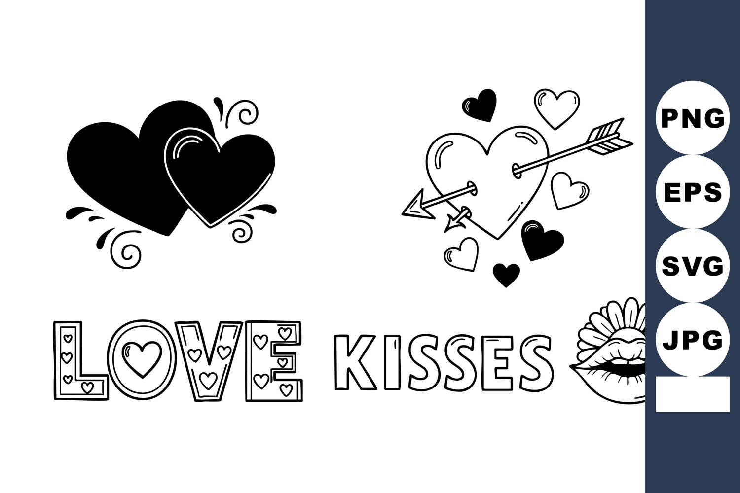 Playful black and white vector art combines overlapping hearts, arrow shot heart, patterned love and kisses typography, and floral lips icon, ideal for valentines day cards, coloring pages, and romantic stationery designs, cheerful.