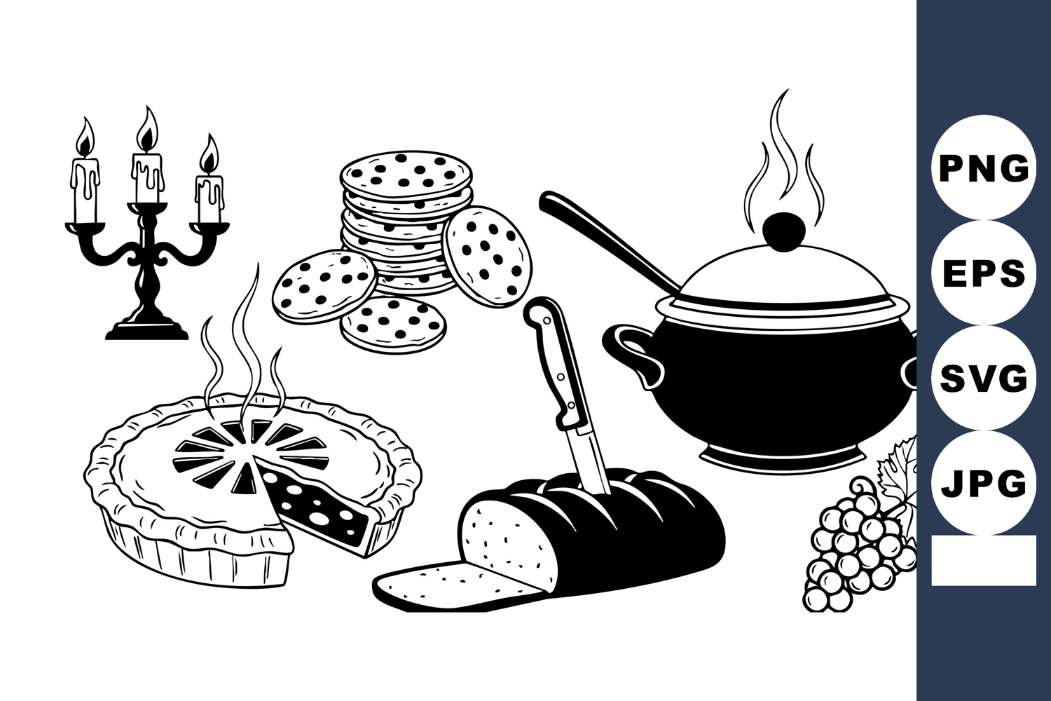 Black And White Restaurant Menu Design Flat Vector Elements Steaming Soup Pot Monochrome Thanksgiving Dinner Sliced Pie Illustration Bread Loaf Graphic Cookie Stack Icon Grapes Fruit Bunch Candle Holder Set
