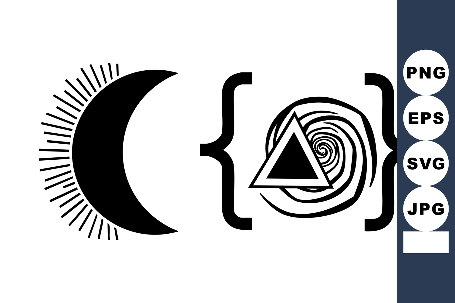 Stylized crescent moon with linear rays balances beside curly brackets surrounding a hypnotic spiral and solid black triangle, creating abstract occult symbolism suitable for tattoo flash, posters, or logo design, mysterious.