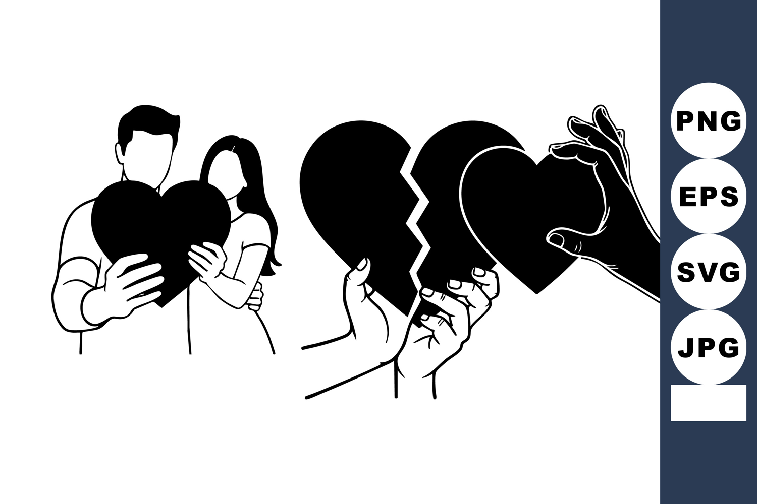 Stylized black and white vector art shows couple embracing heart, broken heart in two hands, and hand offering heart, illustrating relationship stages for social media posts, editorial layouts, and counseling materials, emotional