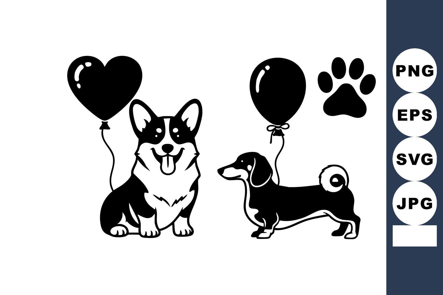 Black And White Paw Print Graphic Cute Cartoon Dogs Heart Balloon Clipart Tshirt Design Clipart Corgi And Dachshund Playful Dog Silhouettes Pet Party Graphics Line Art Dogs Valentine Pet Couple