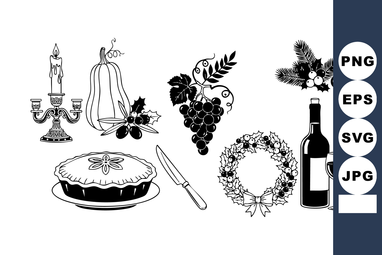 Elegant black and white vector set presents festive holiday elements including pie, wine, candle candelabra, pumpkin, grapes and holly wreath, ideal for Christmas and Thanksgiving invitations, menu layouts and seasonal packaging, cheerful.