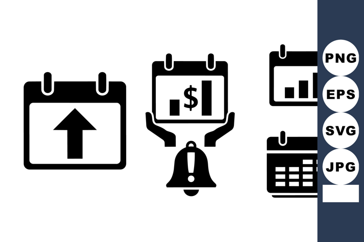 Set of black business calendar icons includes upward arrow growth, financial notification, analytics chart, and weekly planner in simple flat style.