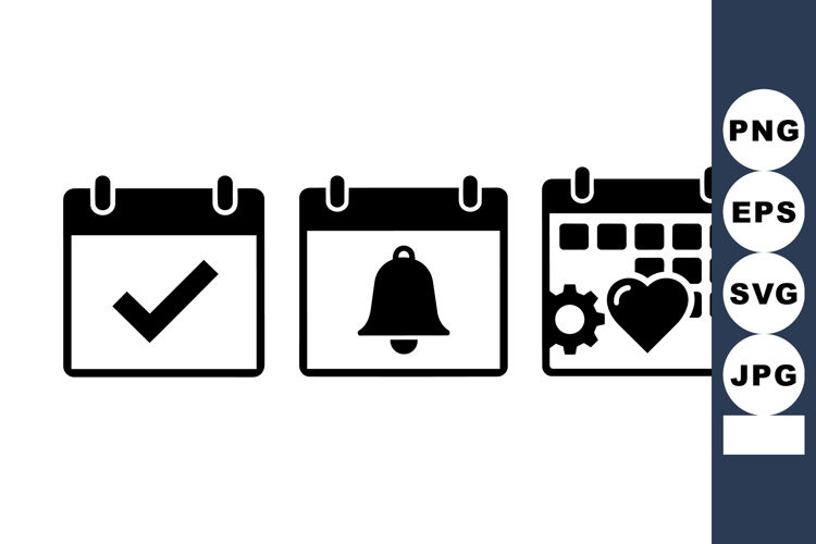 Simple flat design calendar icons featuring check mark, notification bell, and heart with gear for settings, designed in black silhouette style for web and app interfaces.