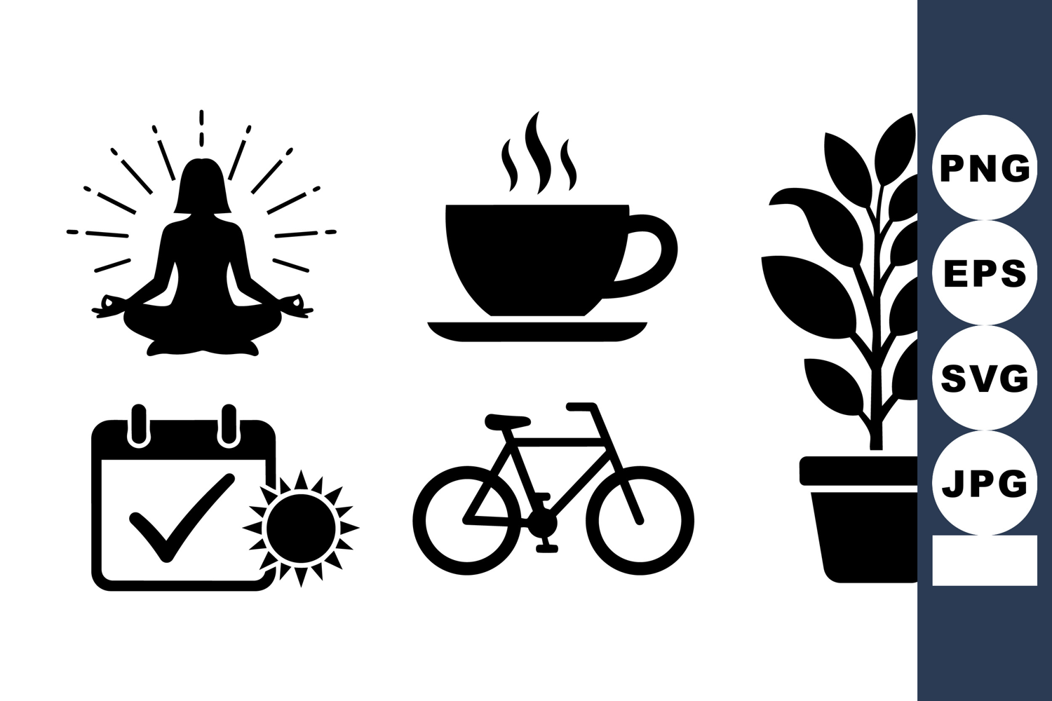 Simple black silhouette icons including a meditating person, steaming coffee cup, bicycle, leafy plant, and calendar with sun and check mark, minimalist style.
