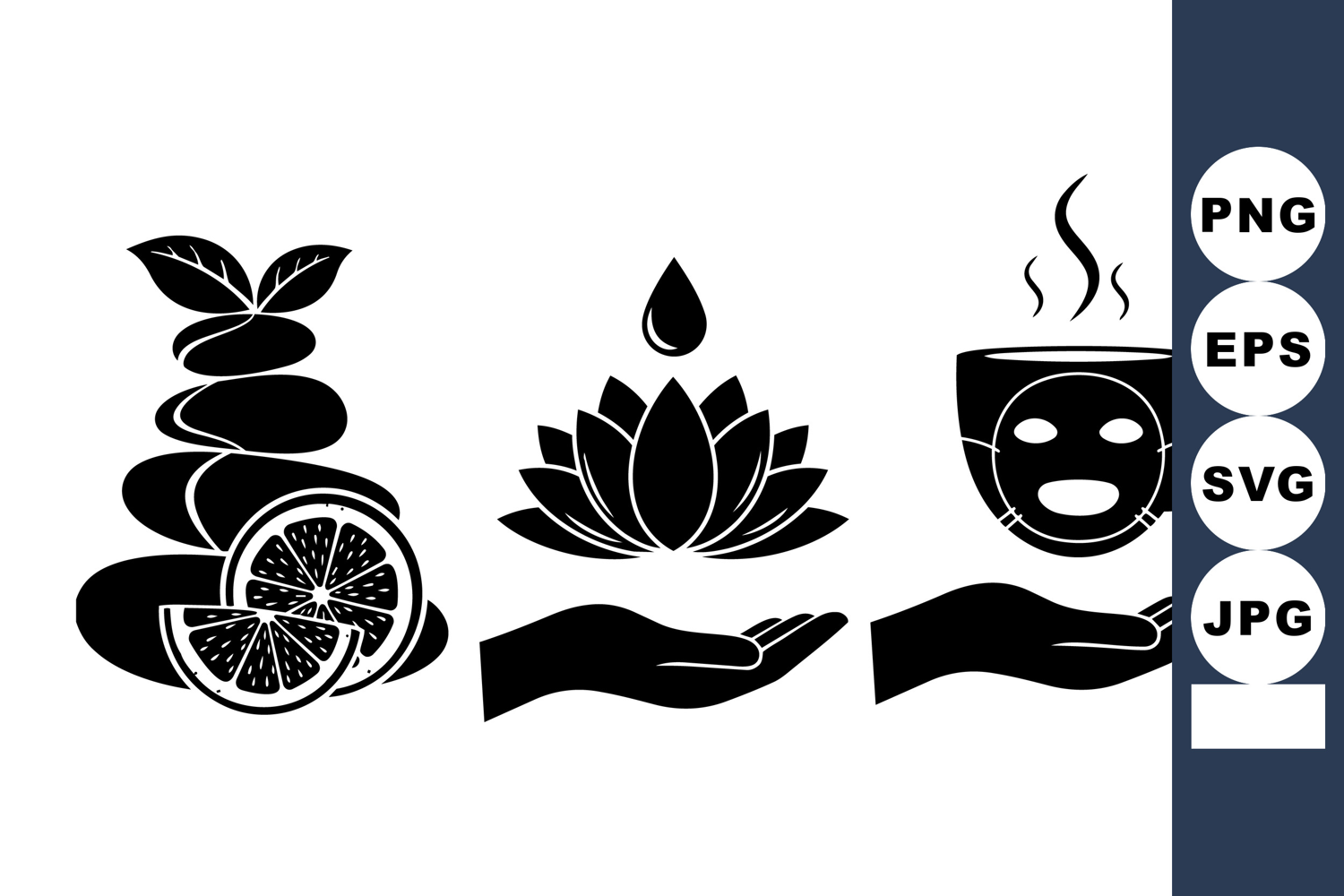 Black silhouette spa themed icons display stacked stones with sliced citrus, a hand holding a lotus flower, and a steaming tea cup offering relaxation vibes.