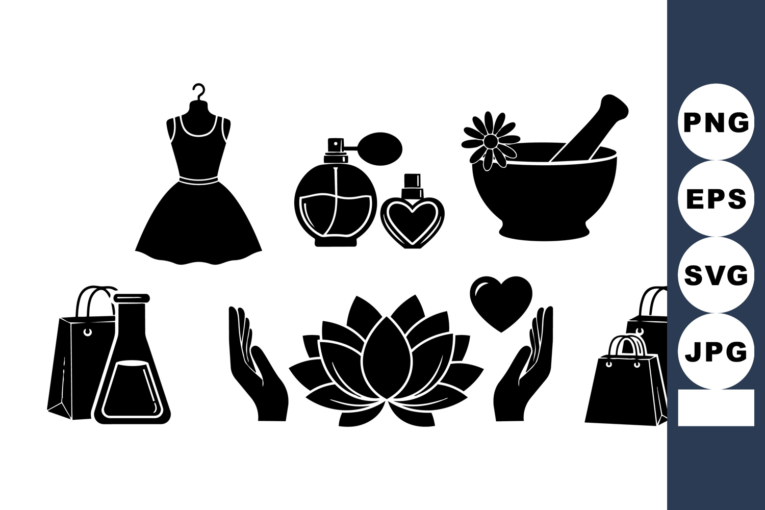 A minimalist black and white icon collection depicting shopping bags, perfume bottles, lotus flower, hands with heart, and a mortar with pestle in flat style, suitable for wellness and retail concepts, clean and simple aesthetic.
