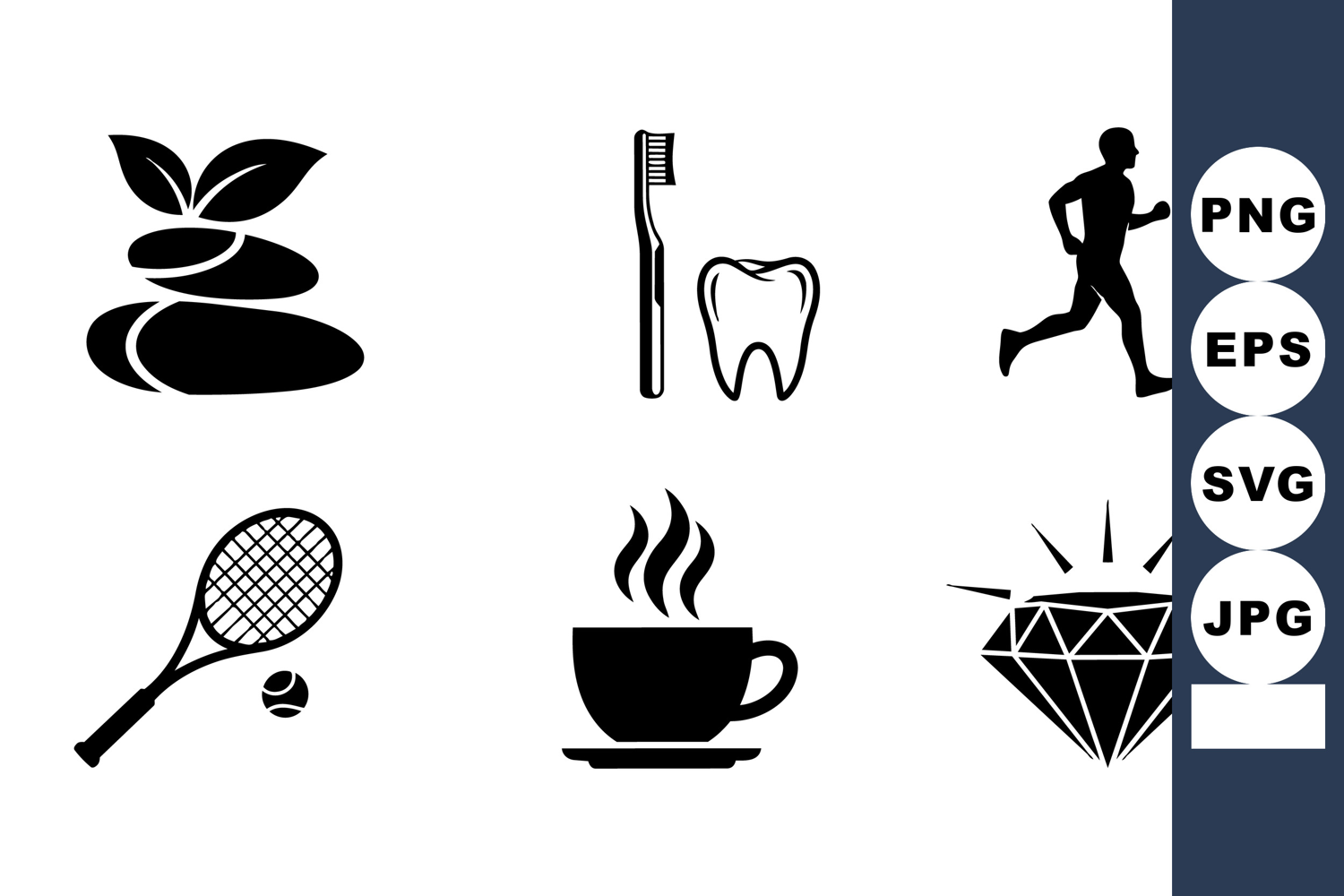 Silhouette vector icons depict various objects including spa stones, a leaf, dental tools, a runner, tennis racket, coffee cup, and diamond gem in simple black style.