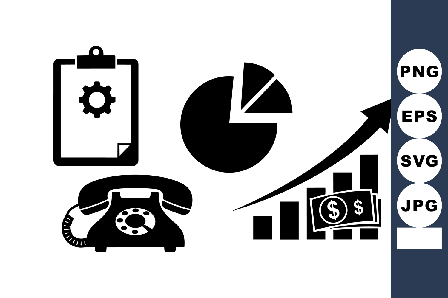 Minimalist black and white vector icons depicting a vintage telephone, gear clipboard, pie chart, and financial growth with ascending bar graph and dollar signs, simple and clear design useful for business or technology concepts.