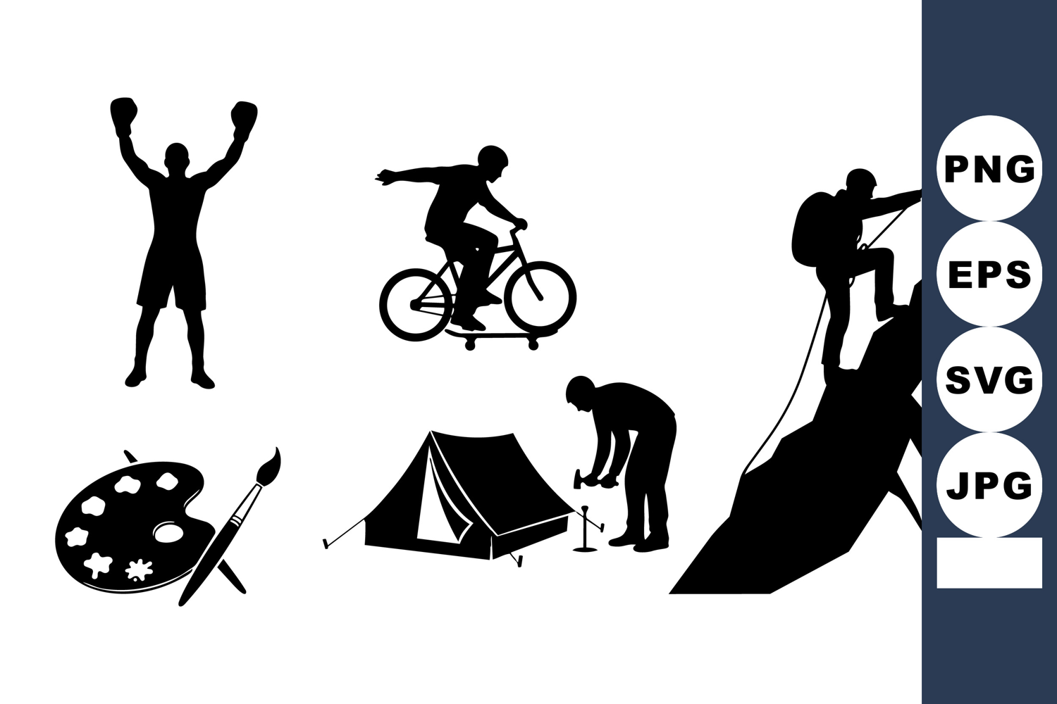 Silhouette Vector Set Outdoor Adventure Bundle Hiking Clipart Pack Camping Graphics Collection Mountain Climbing Kit Cycling Silhouette Bundle Painting Art Set Nature Activity Pack Recreational Vector Graphics Active Lifestyle Bundle