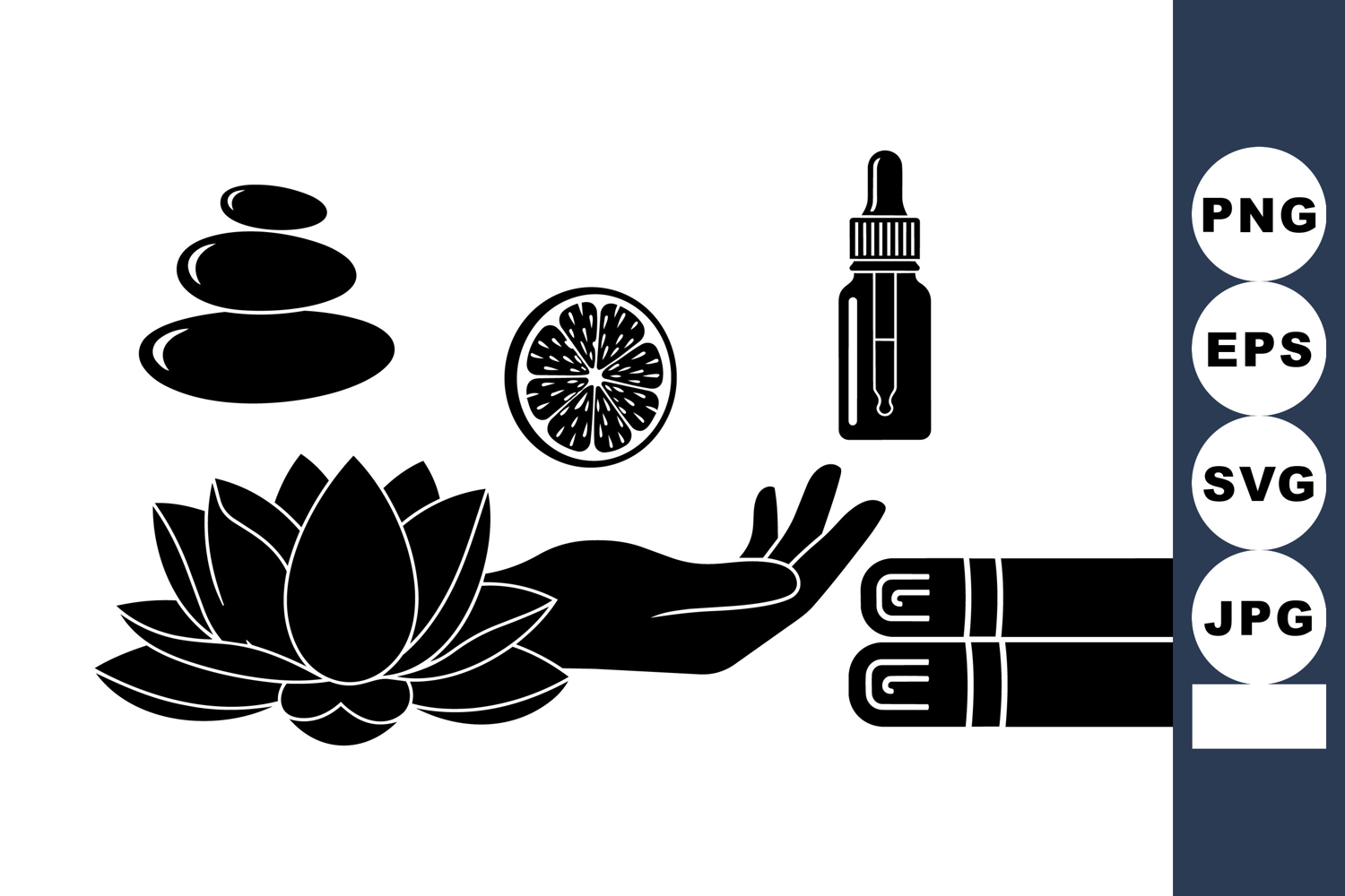 Minimalist black silhouette icons depicting spa elements including lotus flower, hand, stacked stones, towels, lemon slice, and essential oil bottle for wellness themes.