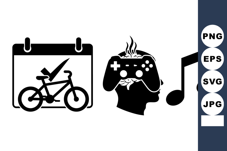 A minimalist black silhouette vector set featuring a calendar with a bicycle check mark, a gamer profile with controller, and a musical note symbol for leisure concepts.