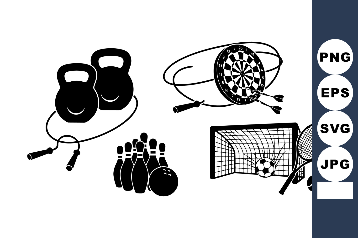 A collection of black and white silhouette sports equipment including kettlebells, jump rope, dartboard, bowling pins, soccer goal, and tennis racket with ball in vector style.