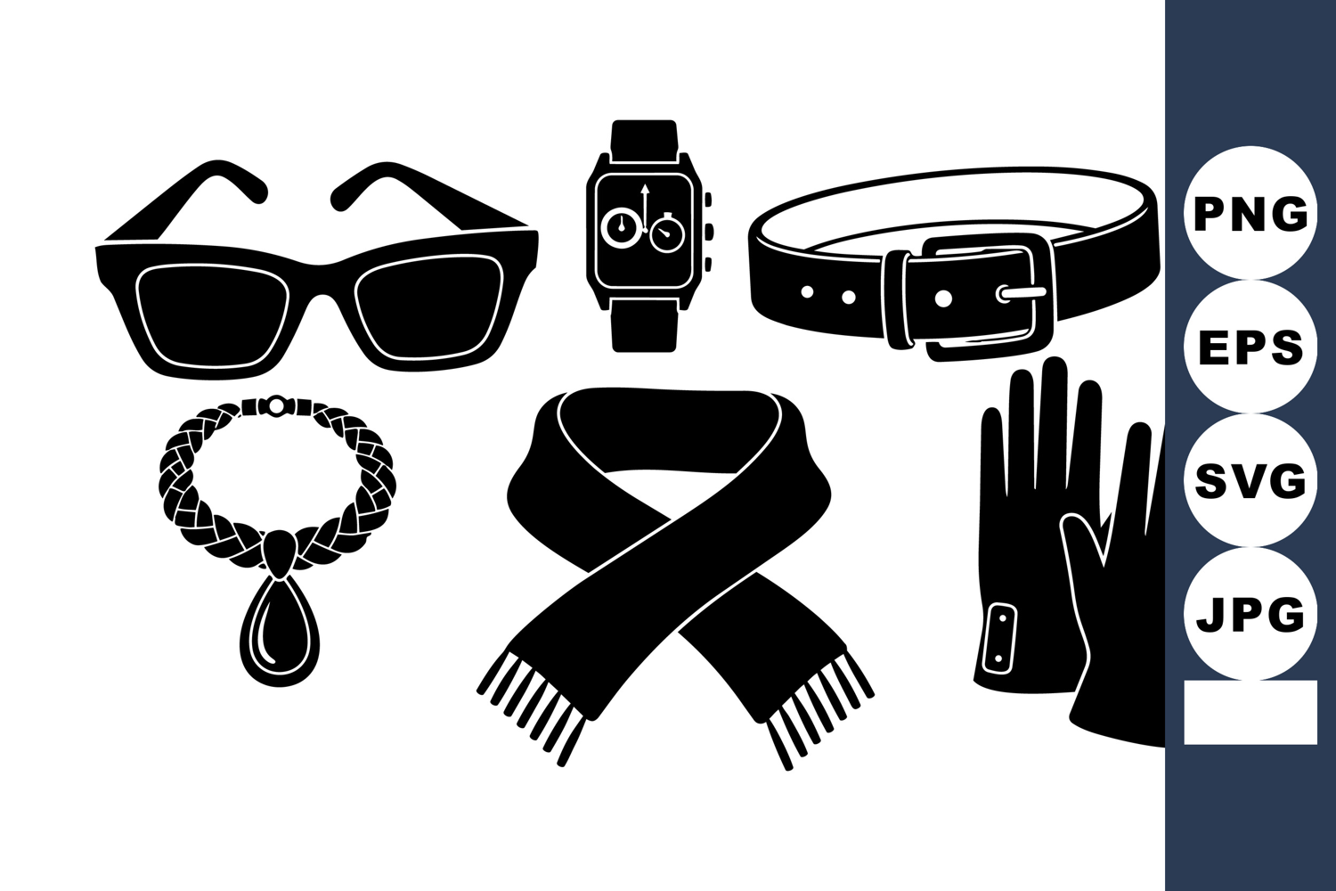 Set of black and white vector accessories includes sunglasses, wristwatch, belt, necklace, scarf, and gloves in flat design style for fashion and winter themes.