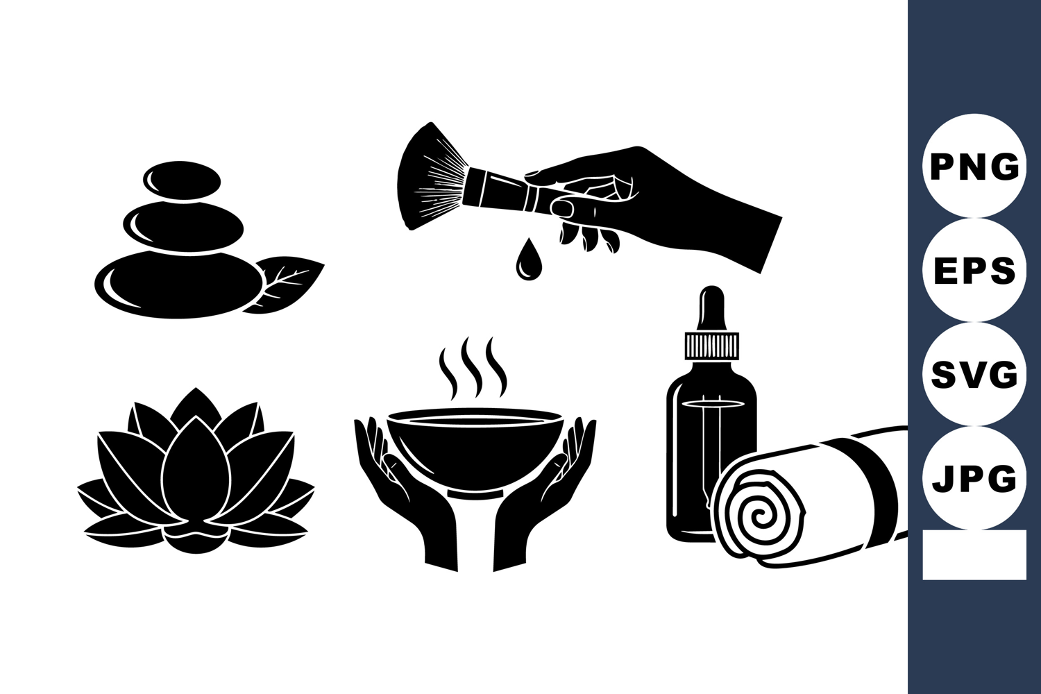 Black silhouette spa icons show hand pouring oil, stacked stones, lotus flower, steaming bowl, bottle, and rolled towel in minimalist style.