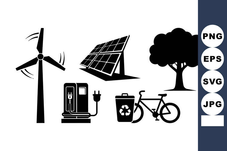 Electric Vehicle Icon Solar Panel Vector Environmental Icon Pack Eco Transport Icons Renewable Energy Graphics Wind Turbine Design Nature Conservation Clipart Green Lifestyle Bundle Recycling Symbol Graphics Bicycle Silhouette Set