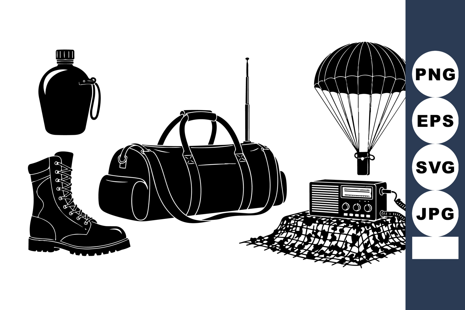 Military Silhouette Clipart Combat Equipment Set Soldier Accessories Pack Tactical Gear Bundle Parachute Landing Vector Military Boots Clipart Duffle Bag Silhouette Radio Communication Vector War Supplies Kit