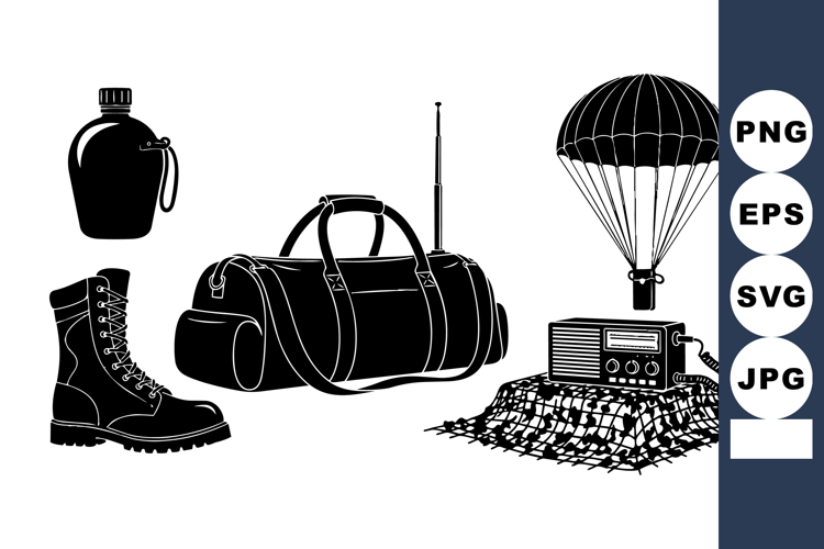 Black and white vector illustration of military gear including boots, canteen, duffel bag, and airdropped radio supplies, styled with clean lines for tactical and military themed designs.