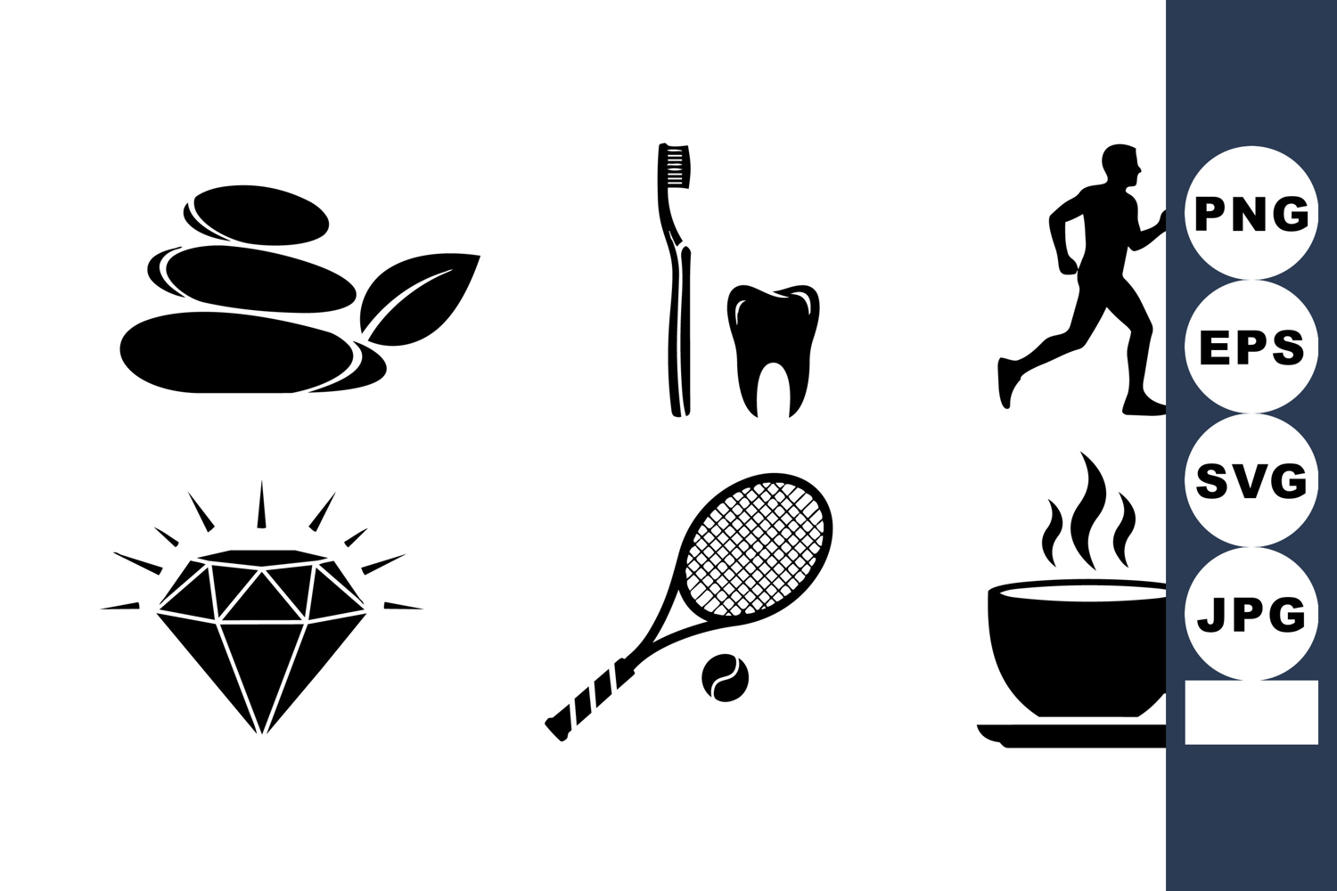 A collection of black silhouette icons includes spa stones, a toothbrush, tooth, runner, tennis racket, coffee cup, and diamond jewel representing wellness and lifestyle themes.