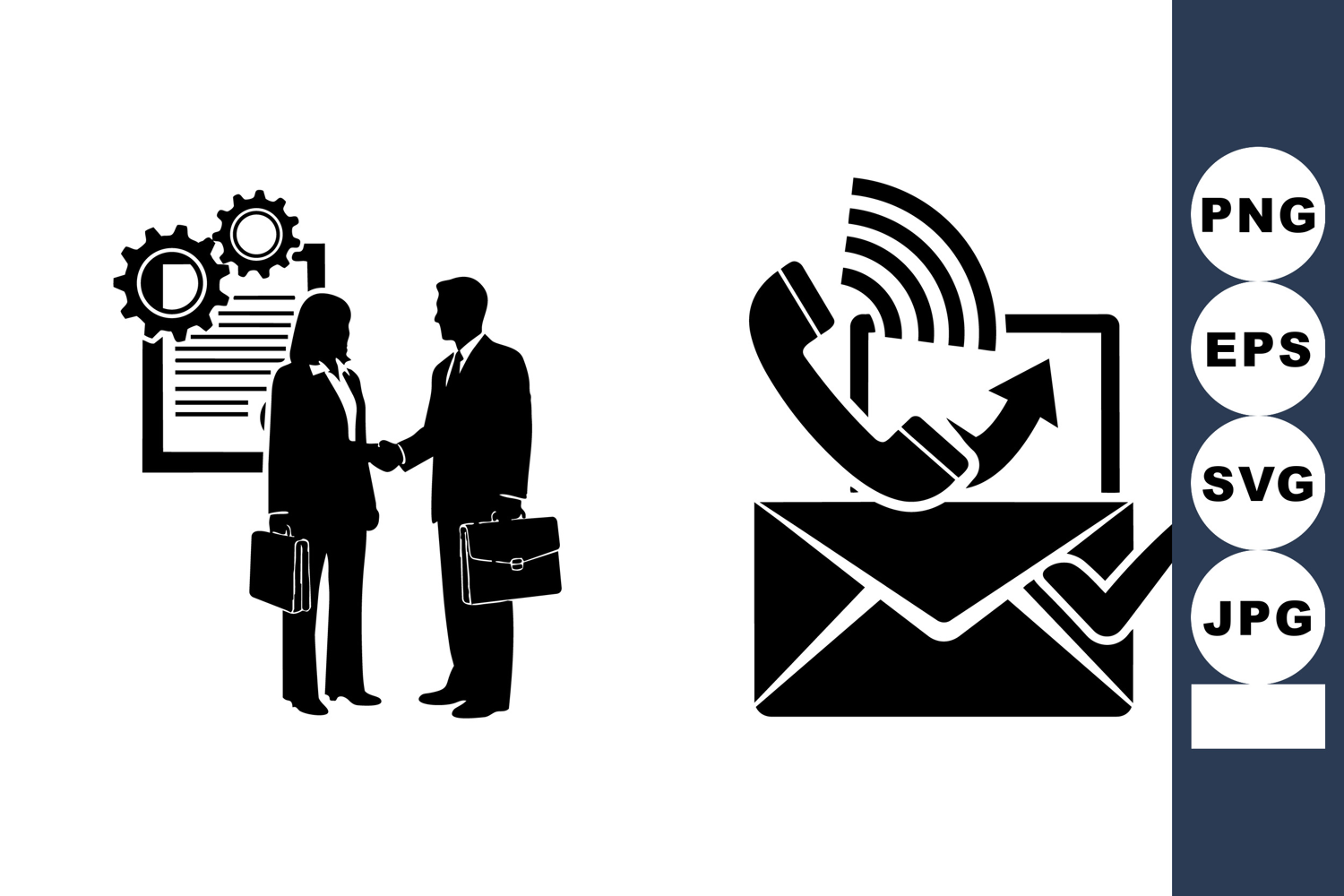 Silhouetted businesspeople shake hands with briefcases and gears beside communication icons including phone, envelope, and checkmark representing connectivity and agreement.