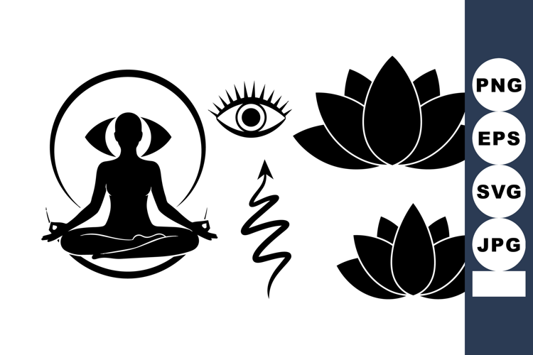 Black silhouette vector features a meditation figure surrounded by lotus flowers and eye symbol showcasing spiritual and mindfulness concepts in minimal style.