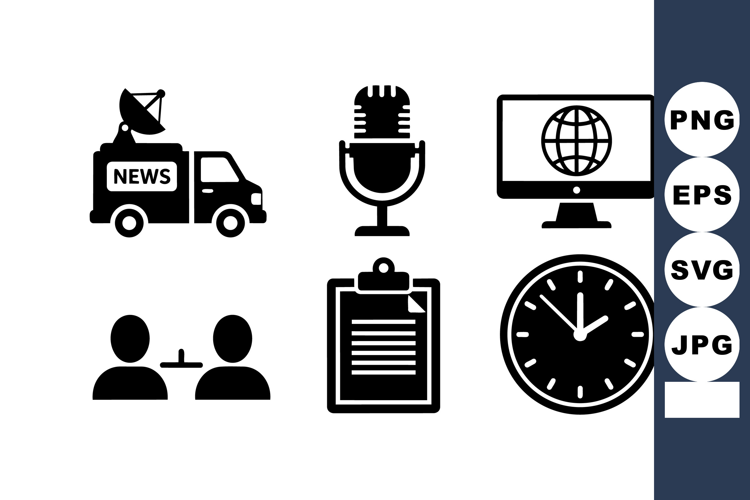 Minimalist black icons include news van, microphone, globe on computer screen, people meeting, clipboard, and clock in vector style for digital and print use.