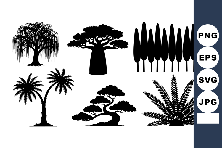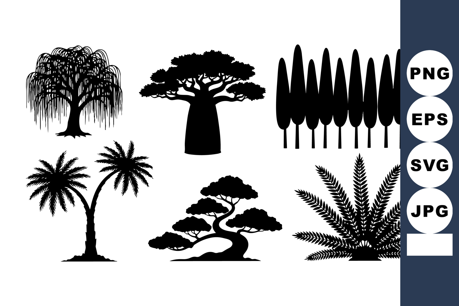 Silhouetted trees such as willow, palm, baobab, cypress, and aloe plant in minimalist flat vector art suitable for design projects and nature themes
