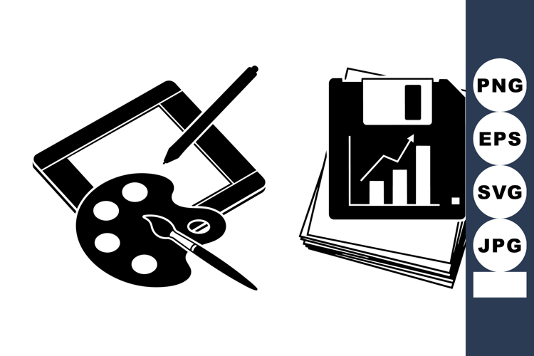 Minimalist black and white flat design featuring a graphic tablet with paint palette and pen alongside stacked floppy disks with bar graphs, symbolizing digital art and data storage.
