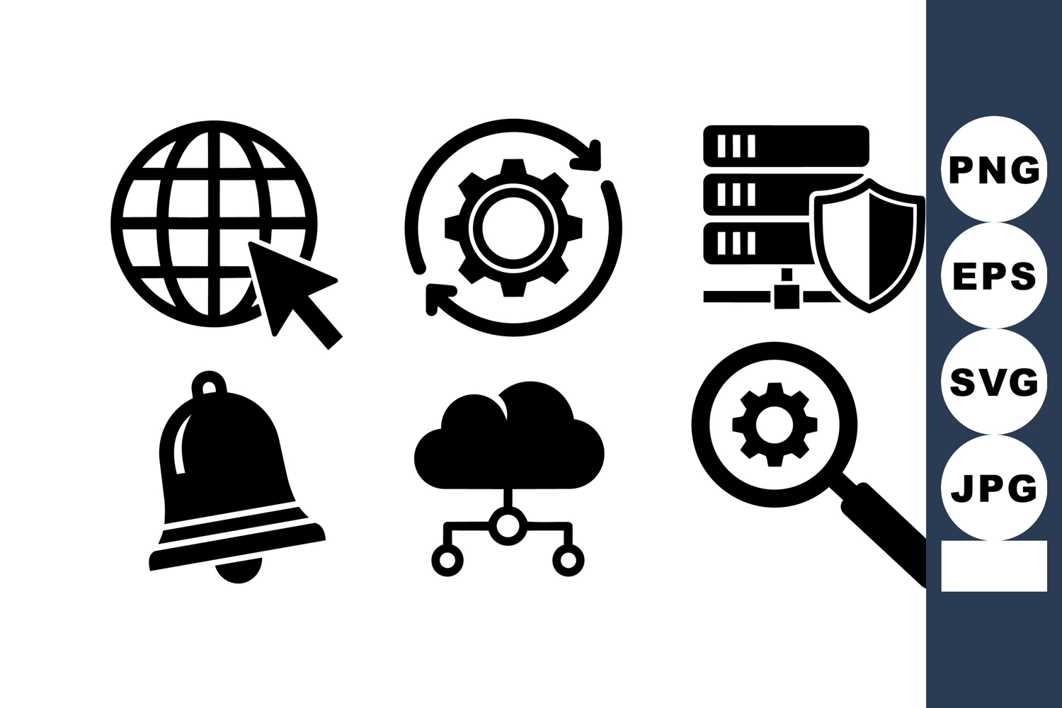 Set of simple black icons showing internet globe cursor, gear cycle, secured server, notification bell, cloud network, and magnifying glass with gear in minimalist style.