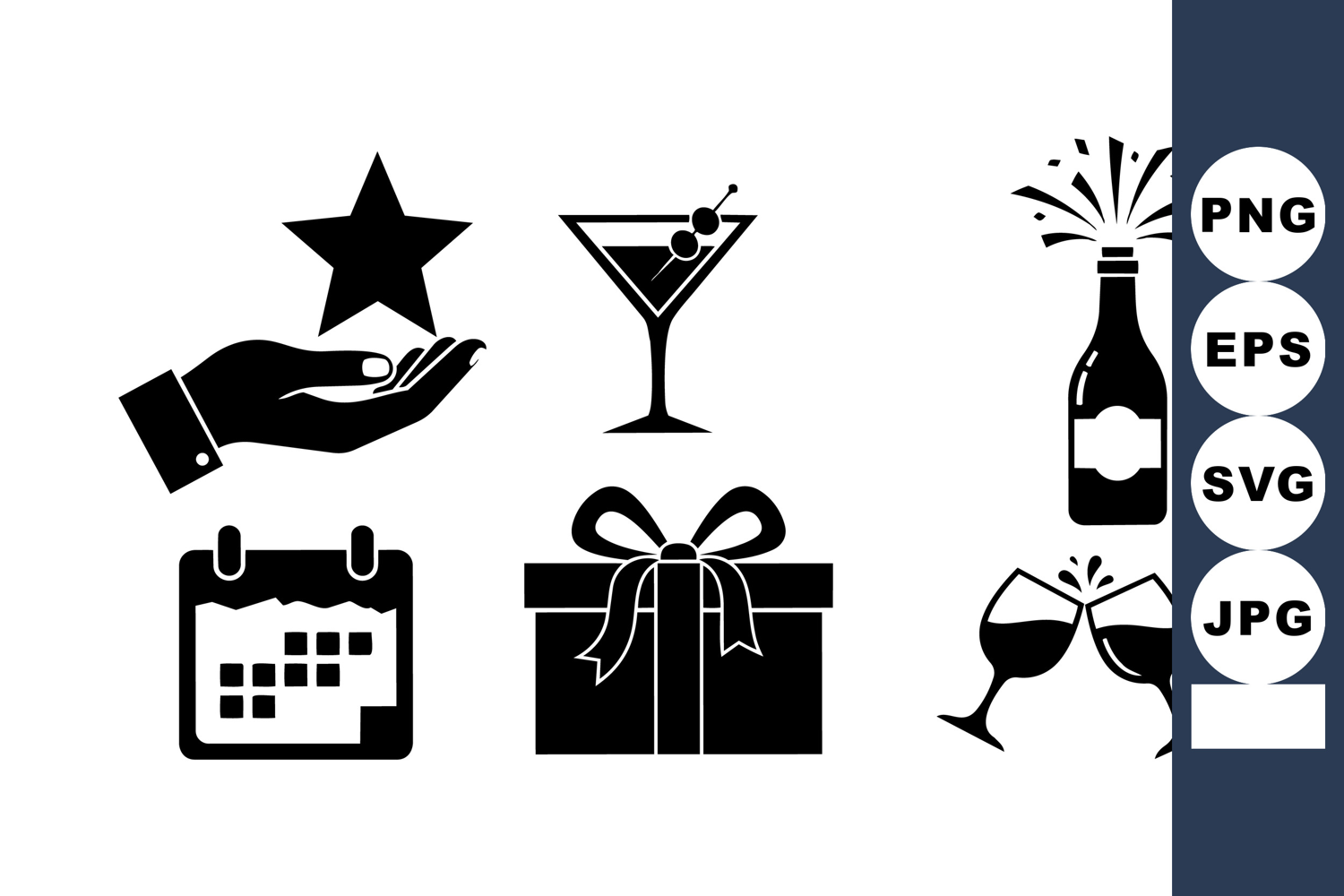 Collection of black silhouette celebration icons including hand with star, cocktail glass, gift box, calendar, champagne bottle, and clinking wine glasses in minimalist style