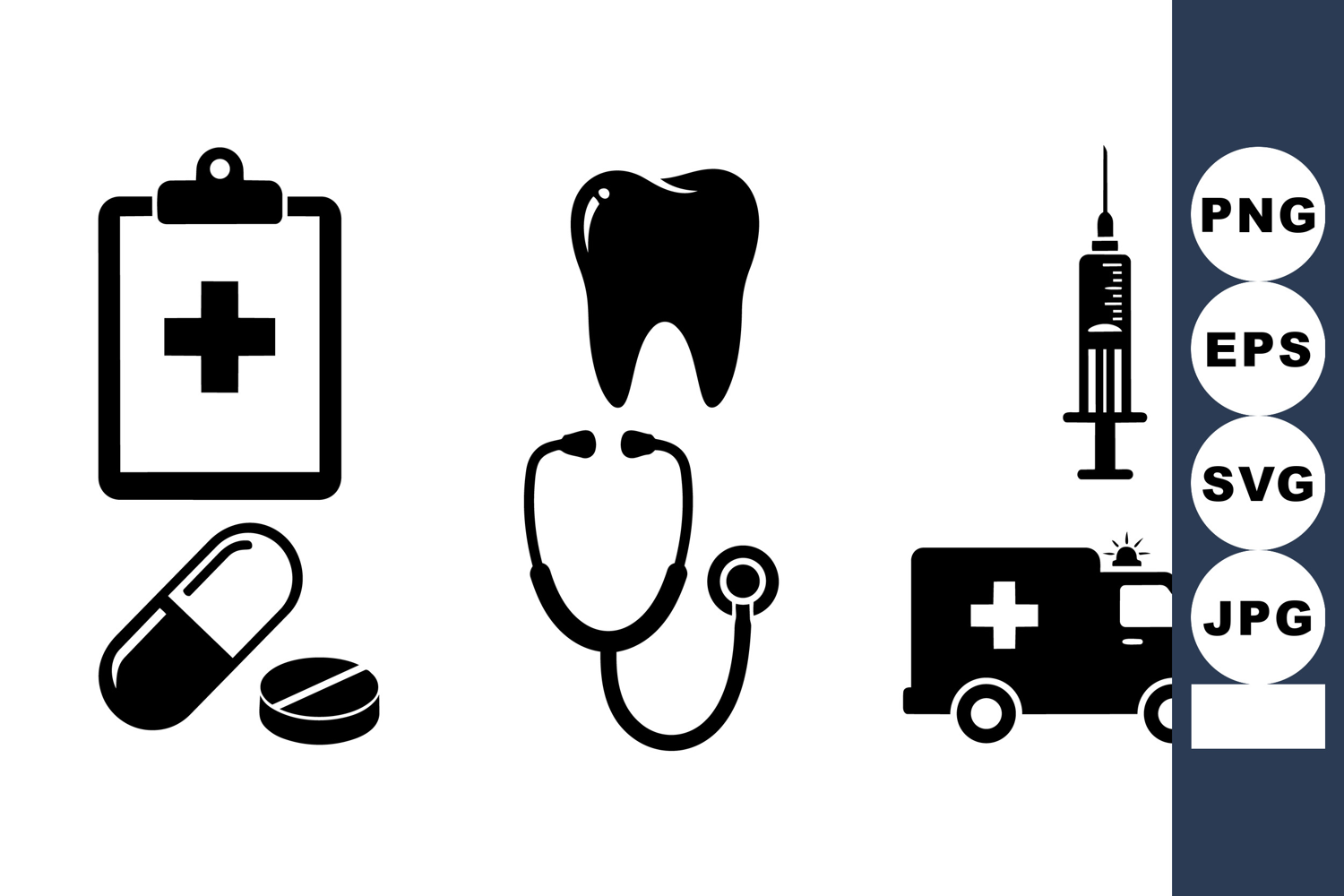 A set of black medical icons featuring a tooth, stethoscope, ambulance, syringe, pills, and clipboard, presented in clear vector style for versatile healthcare use.