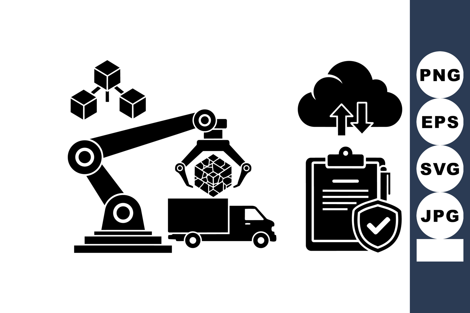 Industrial Automation Icons Robotic Arm Clipart Logistics Delivery Graphics Cloud Data Icons Smart Factory Illustrations Machine Control Set Technology Svg Bundle Digital Network Clipart Factory Process Icons Engineering System Graphics