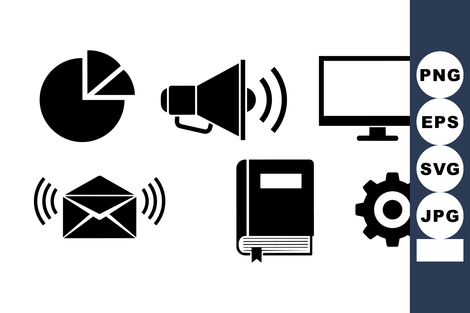 Black minimalist flat design icons representing business, communication, technology, and office concepts including pie chart, speaker, monitor, email, book, and gear.