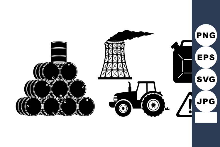 Hazard Warning Symbol Black Silhouette Pack Industrial Farm Equipment Tractor Vector Clipart Oil Barrel Silhouettes Factory Smoke Stack Fuel Container Icon Agriculture Machinery Set Farm Vehicle Graphics Manufacturing Industry Icons