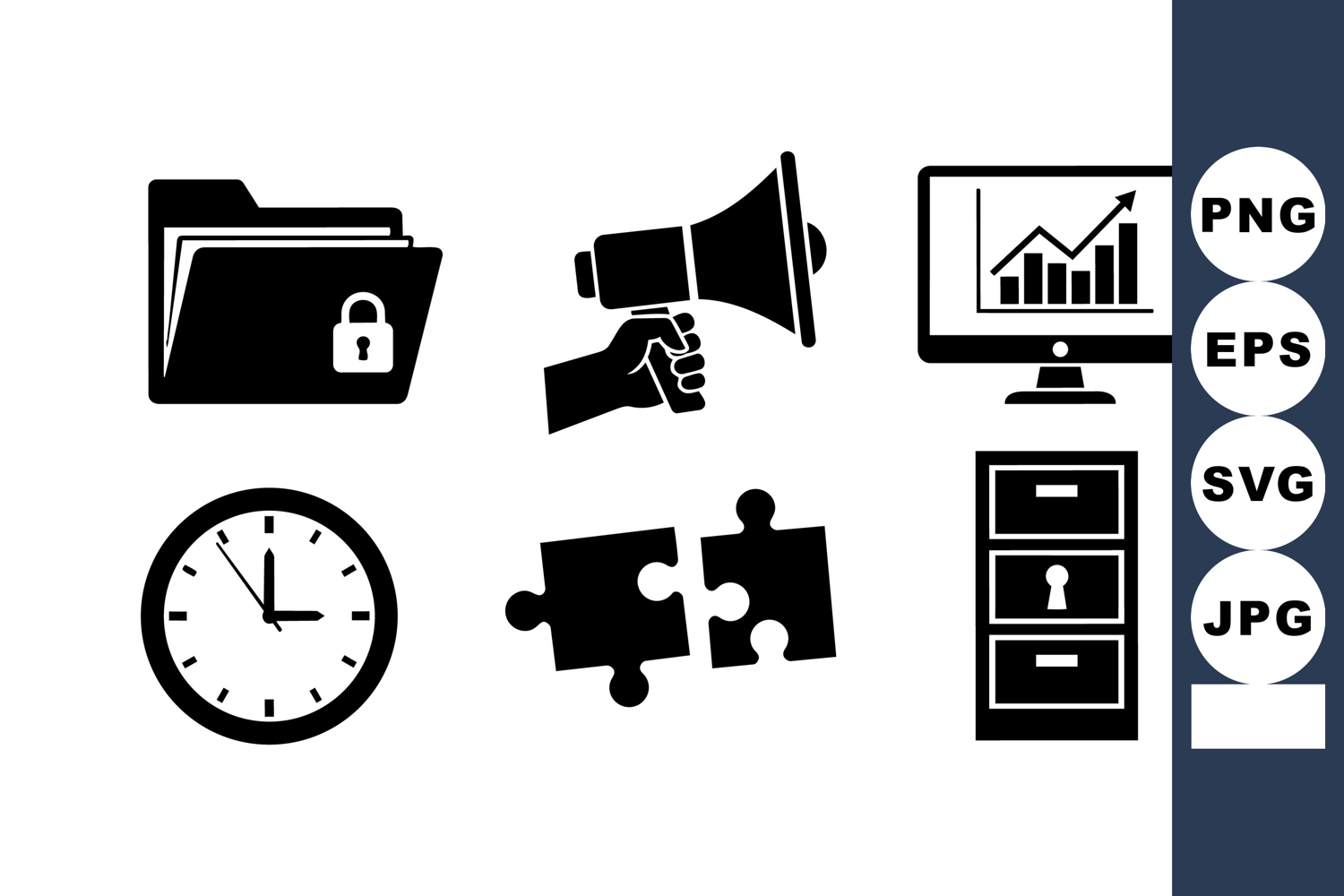 Simple black business icons including locked folder, megaphone, upward graph on screen, clock, puzzle pieces, and locked filing cabinet in minimalist style