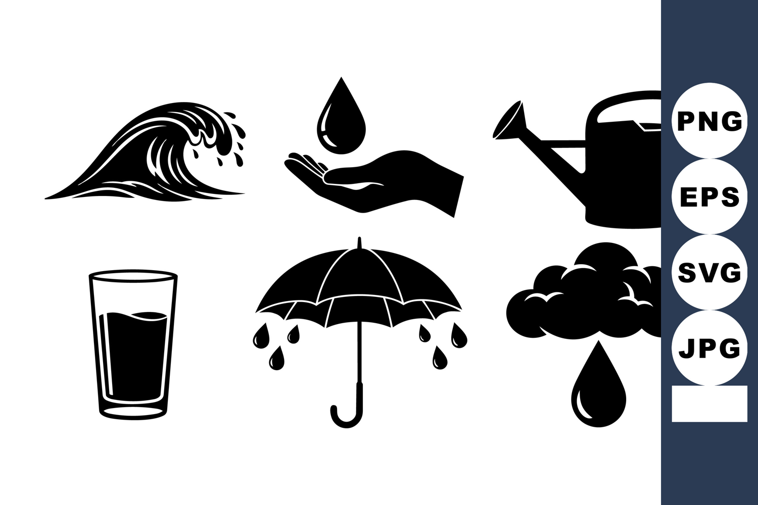 Collection of black water related silhouette icons including ocean wave, hand catching water drop, watering can, umbrella with rain, cloud, and glass of water displayed in minimalist style