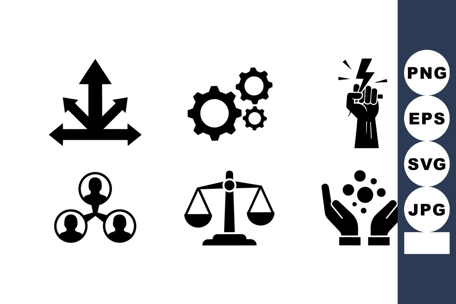 A collection of black silhouette icons including directional arrows, gears, fist with lightning, scale, and hands holding dots, designed in flat vector style for business concepts.