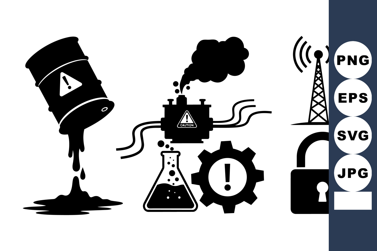 Security Lock Symbol Industrial Hazard Icons Chemical Safety Warning Oil Spill Silhouette Factory Gear Icon Pollution Risk Sign Black Hazard Vectors Industrial Warning Set Toxic Spill Clipart Safety Alert Graphics