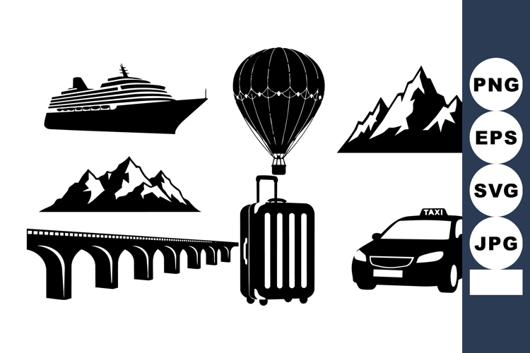 Collection of black silhouette travel and transportation icons including a cruise ship, hot air balloon, mountain range, viaduct, suitcase, and taxi vector illustrations.