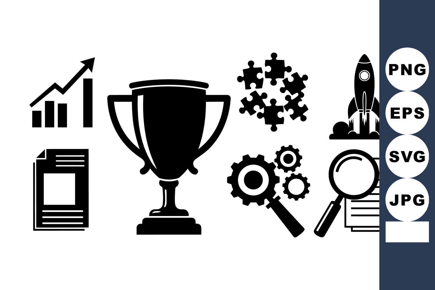 Set of black silhouette icons including a trophy cup, magnifying glass with gears, documents, rocket launch, and upward graph symbolizing success and analysis in minimal style.