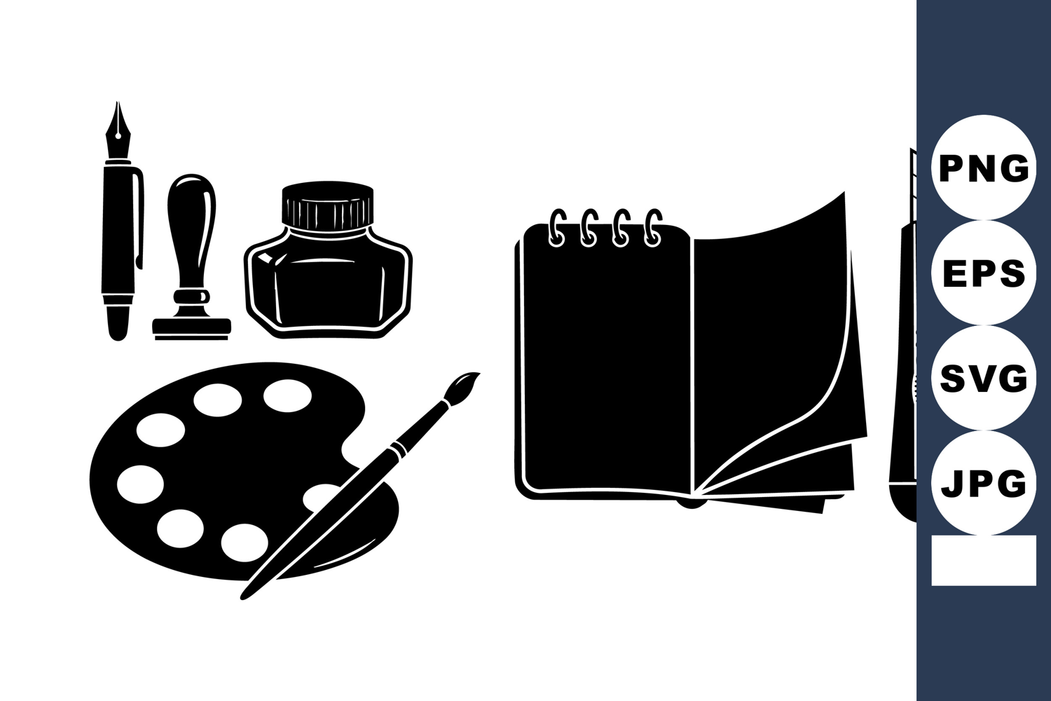 A collection of solid black silhouette icons showing classic art and craft tools like pen, palette brush, ink bottle, sketchbook, and utility knife in flat style