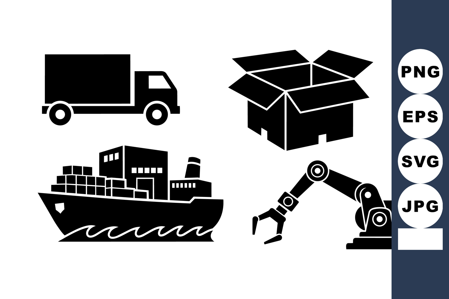 Black silhouette icons show shipping truck, open box, cargo ship, and robotic arm representing transportation and manufacturing in logistics and industry.