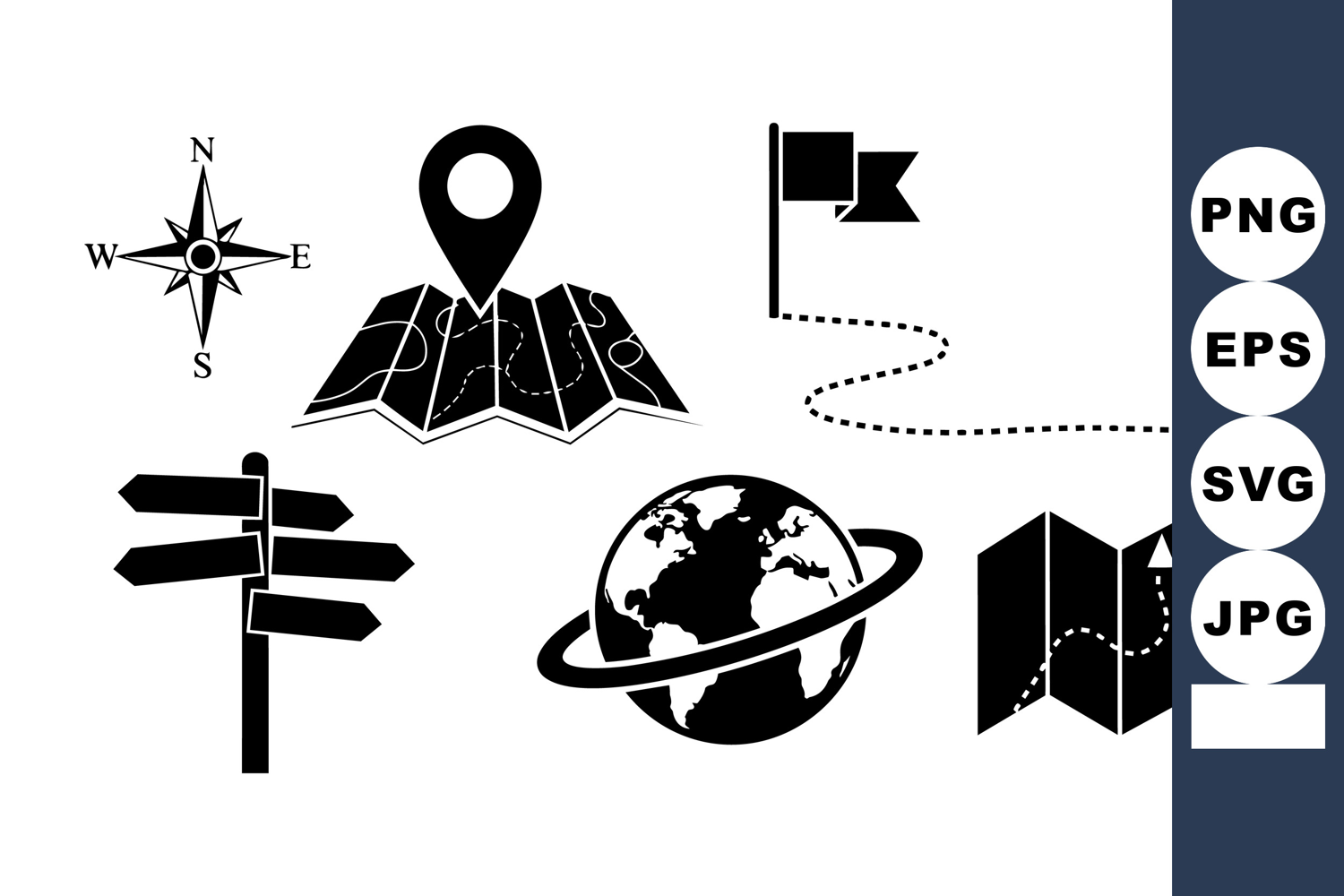Black flat design icons of travel essentials such as compass, globe, directional signs, map with location pin, and flag symbol for navigation and exploration themes