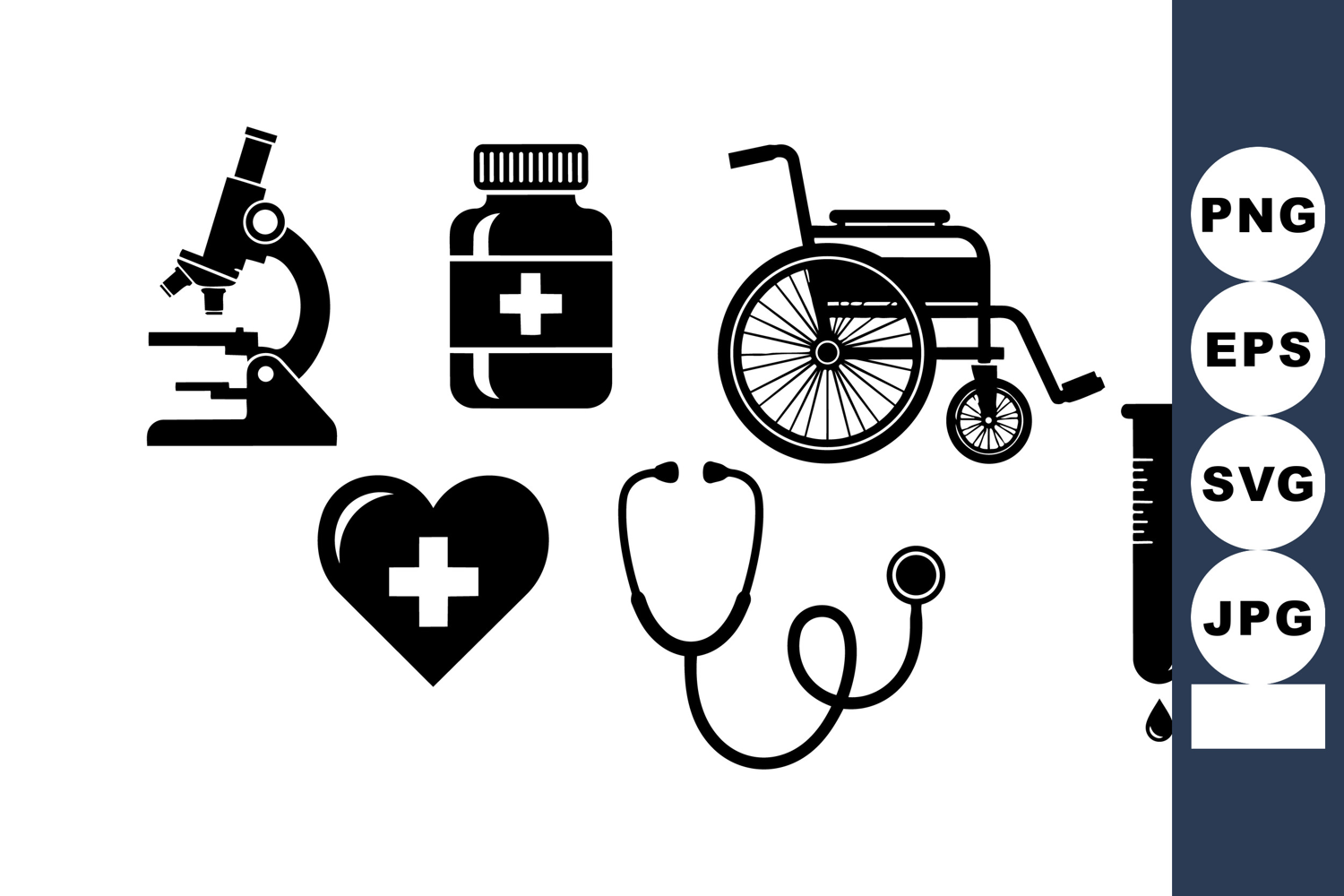 Set of black silhouette medical icons including microscope, pill bottle, wheelchair, stethoscope, heart with cross, and syringe with drop in clean vector style for healthcare designs.