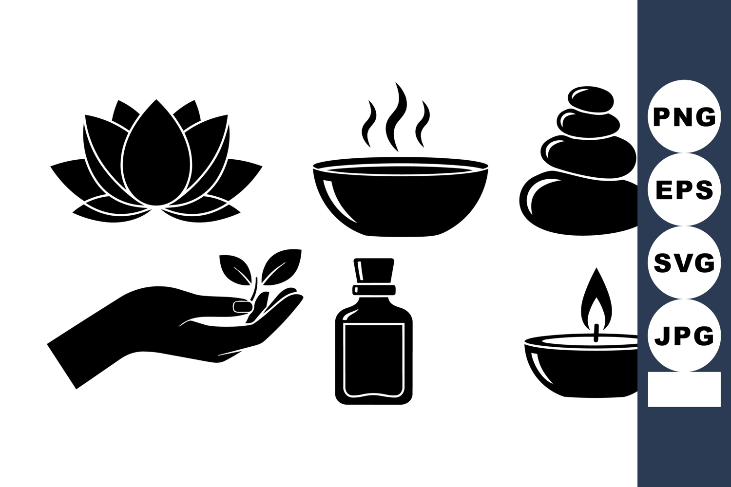 Collection of black silhouette wellness symbols including lotus, steam bowl, balanced stones, nurturing hand with leaf, essential oil bottle, and burning tea candle in flat design style.